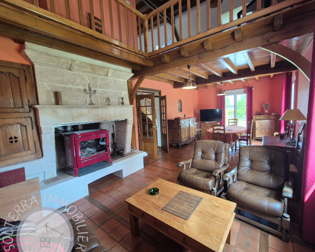 La maison est équipée de double vitrage, d’un chauffage central au fioul et de deux inserts à bois pour un confort optimal toute l’année.